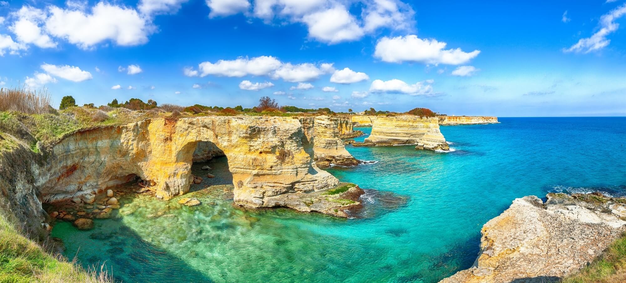 How to make the most of such a delightfully intriguing region? Cultural and food and wine tours are excellent ways of deepening your love affair with Puglia, but sporty types can count on a superb feather in the cap: the detailed, carefully maintained web of walking and cycling paths that feature everywhere in the region.  The land seems perfect for biking, long stretches of meadows and plateaus that are just too inviting to resist. North to south, it’s a world of breath-taking opportunities. Ride or walk in the Salento area – a region within a region where the sun, sea and wind set the pace. Explore Otranto, the fish market in Gallipoli or indulge in local Primitivo and Salice Salentino wines as part of your tours. Visit Alberobello on your hikes and – why not – take up a special lab that will teach you a new technique, such as sculpture with the local stone. Sleep in a luxury masseria and experience the joys of a proud, riveting, sensational culture.