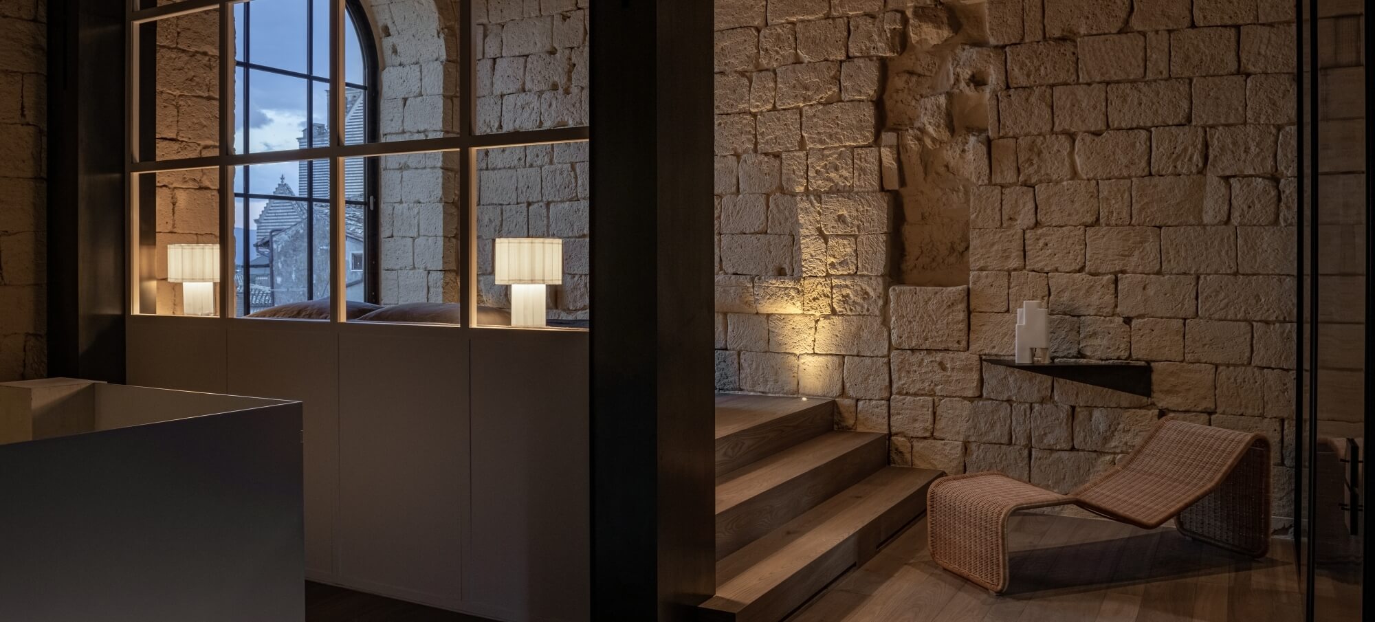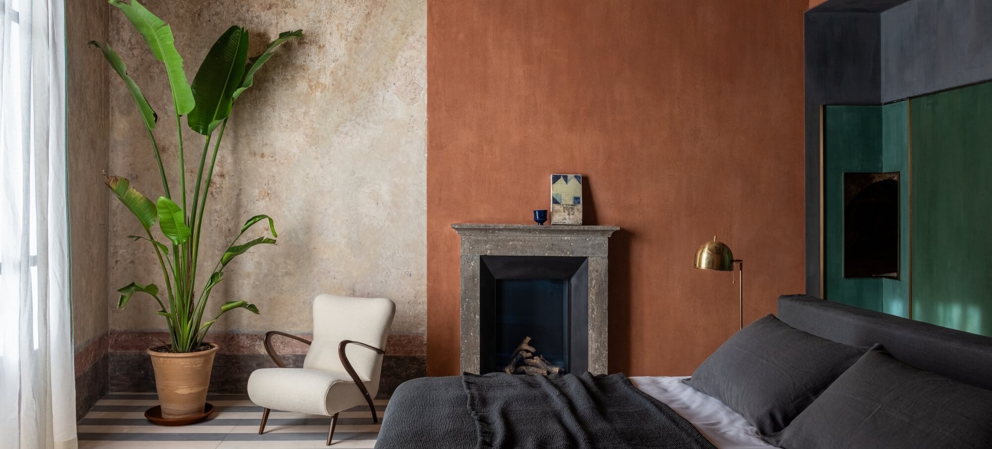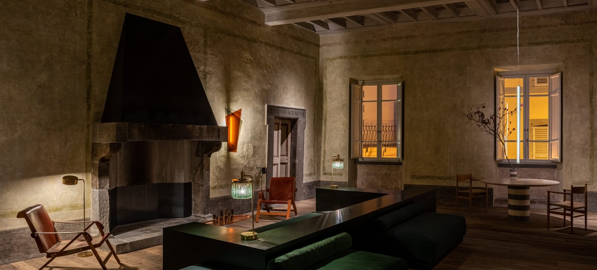 Inside, original frescoes, vaulted ceilings, and travertine stone floors dialogue gracefully with bespoke Italian design pieces, handcrafted lighting, and soft natural fabrics. Every space tells a story — from the restored noble salon to the serene library lounge — where warm tones, locally sourced materials, and the subtle scent of wood and linen create an atmosphere of refined calm.