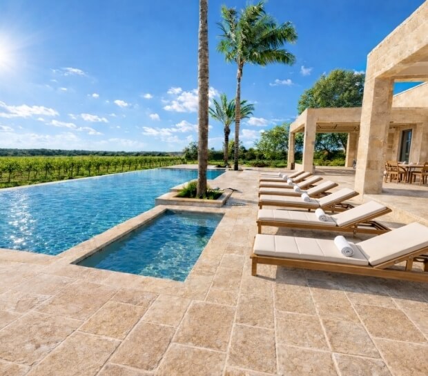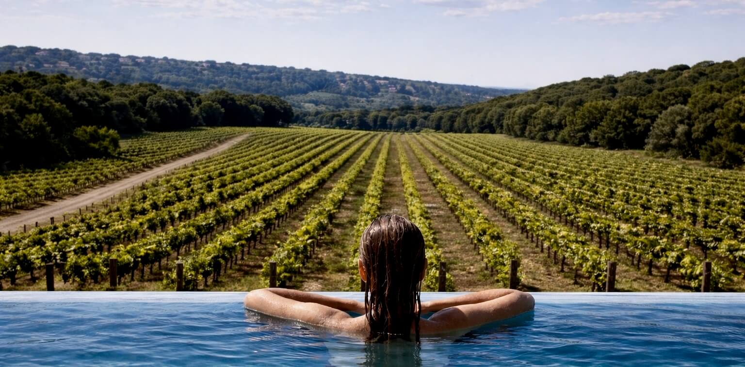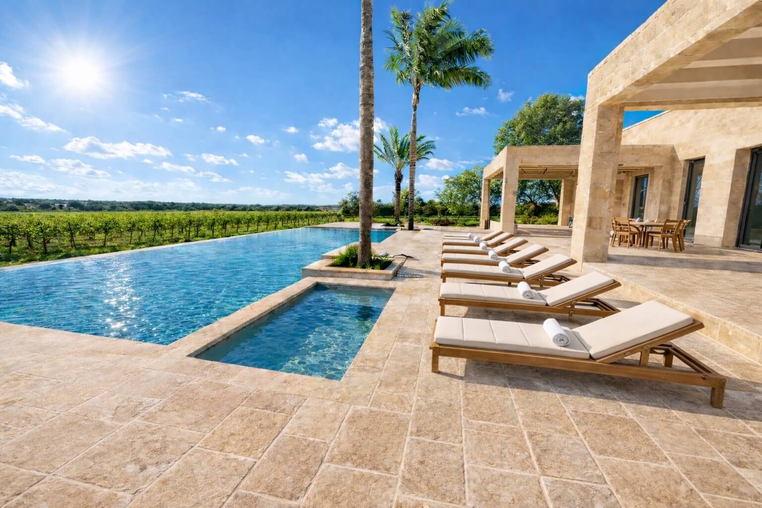 • Pool House (130 m²) featuring: Fully equipped kitchen. Spacious lounge and relaxation area. 6-meter-wide bar for poolside service and events. Roof terrace overlooking the pool and vineyards, ideal for a sunset aperitivo